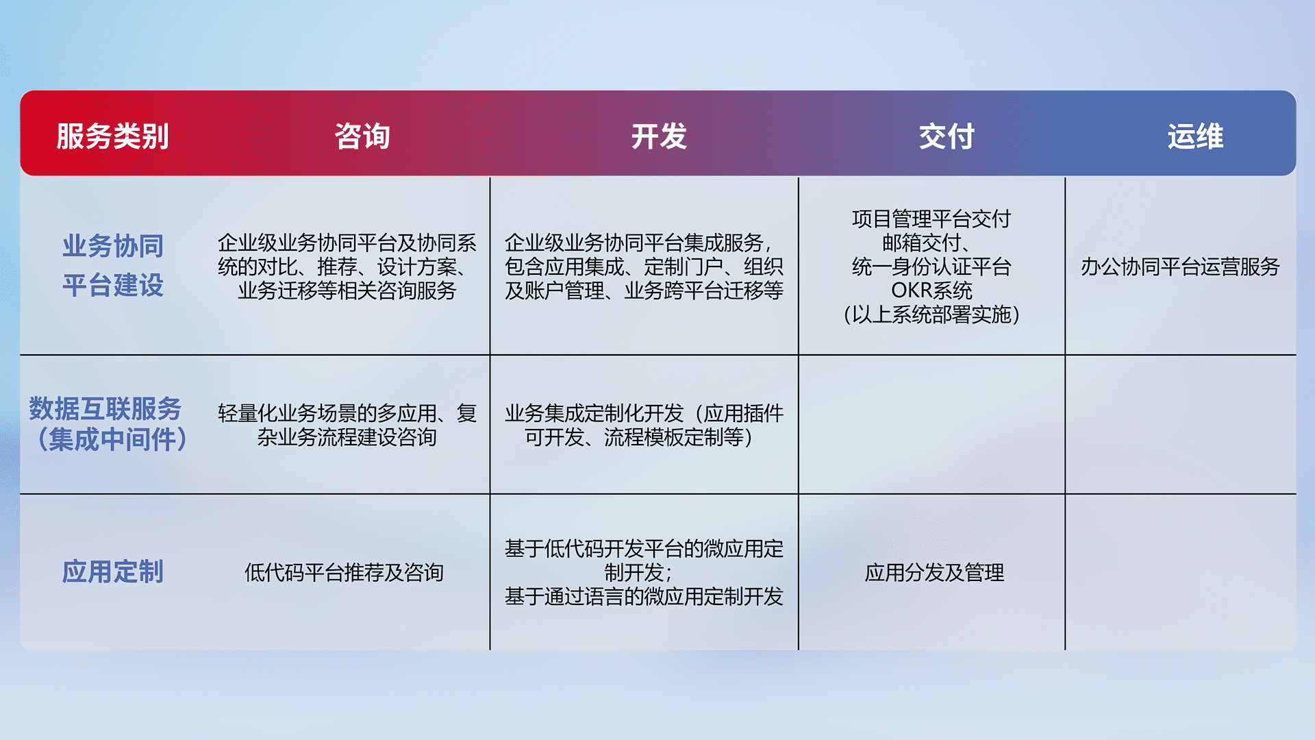 针对钉钉、、、、企微、、、、IDaas等平台级产品提供产品的规划、、方案、、、交付、、定制化开发等服务,,实现如统一协同办公、、、、智能客户服务、、、、混合会议管理、、智能数据查询、、、等业务场景,,实现数字化转型。。。